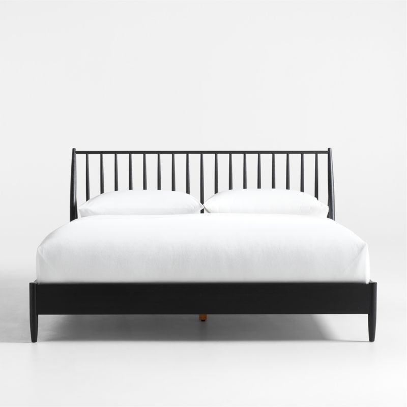 Turned legs and a spindled headboard nod to tradition while clean lines and interesting angles give our Carson bed a decidedly contemporary air. Sleek rails draw the eye to the linear headboard formed by angled legs intersecting with back-tilting supports to frame a row of slender spindles. Made of sustainably sourced hardwood, the bed shows off the wood grain with wirebrushing and a black ebonized finish. Intriguing from all sides, our exclusive Carson bed can be positioned in any way to best suit your bedroom decor.