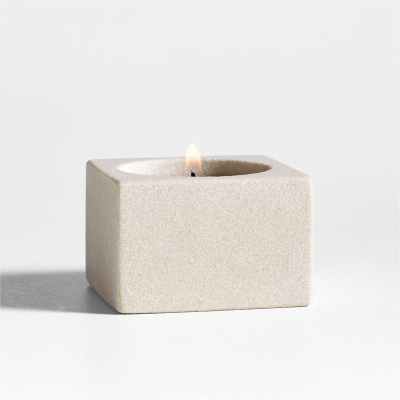 Our Carter candle holder blends crisp geometry with the organic warmth of sandstone. Showcasing the stone's subtle taupe tones, the low, squared-off column nestles a tealight in a round cutout. Group with the larger tealight holders and the other coordinating pieces in our Carter candlelight collection to create a layered effect.