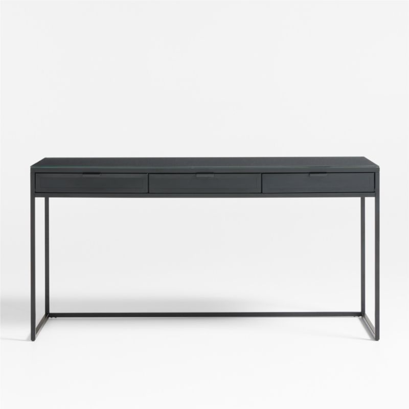 A new addition to our top-rated Casement collection inspired by vintage French casement windows, this sleek and stylish desk gets down to business with clean lines and a chic black finish. The streamlined steel design floats a glass-topped work surface on a linear base with an open and minimalist footprint. Three drawers line up side by side, featuring industrial-inspired latch pulls. The desk's streamlined steel design pairs easily with traditional as well as more modern furniture.