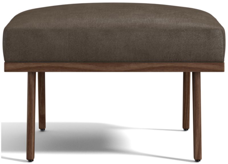 Relax back to another modern time. Cavett's mid-century lines capture the best of 1950s design with this ottoman of solid ash and rich leather. Dramatic design attracts the eye from every angle. A sleek choice for smaller living rooms and family rooms, the leather ottoman upholstered in luxe full-grain, full-aniline leather adds comfort when paired with Cavett Leather Chair. Each leather ottoman is distinguished by the unique characteristics of its beautiful hides, finished with oils and wax for an authentic look that will develop an even richer patina over time. Cavett Leather Ottoman is a Crate & Barrel exclusive.