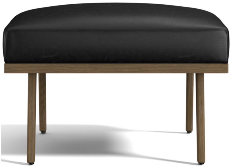 Relax back to another modern time. Cavett's mid-century lines capture the best of 1950s design with this ottoman of solid ash and rich leather. Dramatic design attracts the eye from every angle. A sleek choice for smaller living rooms and family rooms, the leather ottoman upholstered in luxe full-grain, full-aniline leather adds comfort when paired with Cavett Leather Chair. Each leather ottoman is distinguished by the unique characteristics of its beautiful hides, finished with oils and wax for an authentic look that will develop an even richer patina over time. Cavett Leather Ottoman is a Crate & Barrel exclusive.