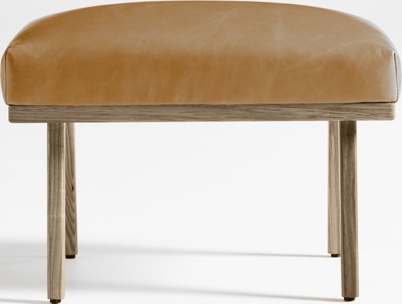 Relax back to another modern time. Cavett's mid-century lines capture the best of 1950s design with this ottoman of solid ash and rich leather. Dramatic design attracts the eye from every angle. A sleek choice for smaller living rooms and family rooms, the leather ottoman upholstered in luxe full-grain, full-aniline leather adds comfort when paired with Cavett Leather Chair. Each leather ottoman is distinguished by the unique characteristics of its beautiful hides, finished with oils and wax for an authentic look that will develop an even richer patina over time. Cavett Leather Ottoman is a Crate & Barrel exclusive.