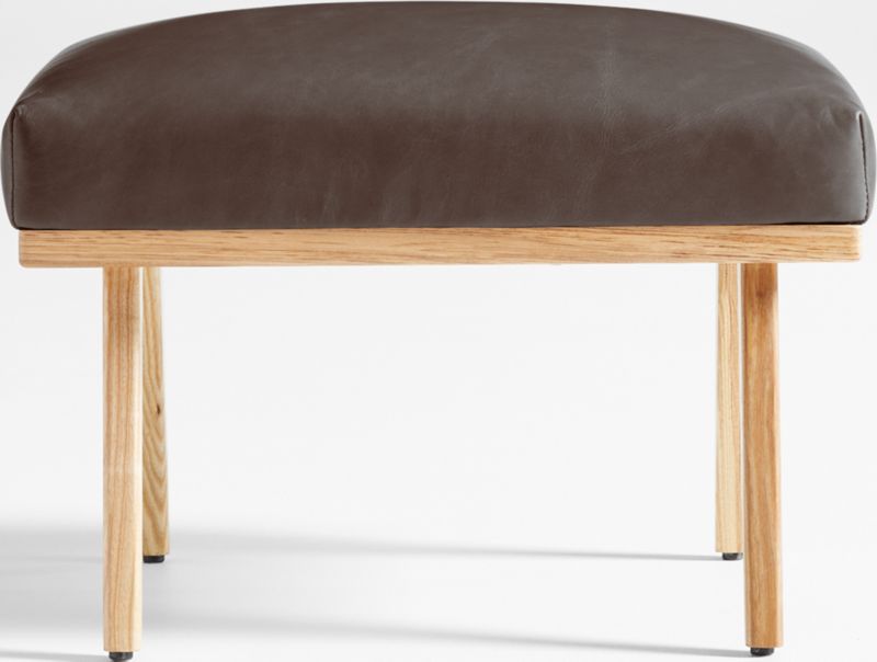 Relax back to another modern time. Cavett's mid-century lines capture the best of 1950s design with this ottoman of solid ash and rich leather. Dramatic design attracts the eye from every angle. A sleek choice for smaller living rooms and family rooms, the leather ottoman upholstered in luxe full-grain, full-aniline leather adds comfort when paired with Cavett Leather Chair. Each leather ottoman is distinguished by the unique characteristics of its beautiful hides, finished with oils and wax for an authentic look that will develop an even richer patina over time. Cavett Leather Ottoman is a Crate & Barrel exclusive.