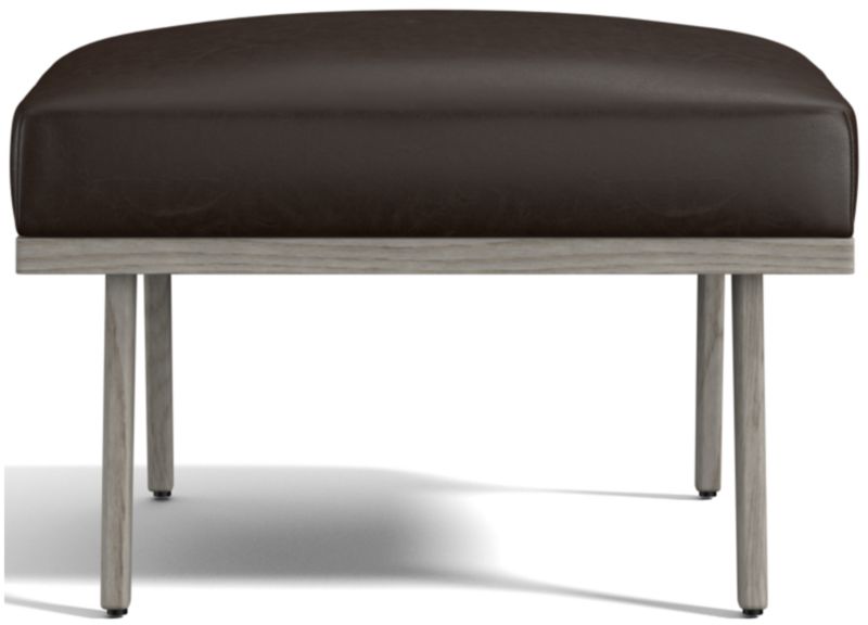 Relax back to another modern time. Cavett's mid-century lines capture the best of 1950s design with this ottoman of solid ash and rich leather. Dramatic design attracts the eye from every angle. A sleek choice for smaller living rooms and family rooms, the leather ottoman upholstered in luxe full-grain, full-aniline leather adds comfort when paired with Cavett Leather Chair. Each leather ottoman is distinguished by the unique characteristics of its beautiful hides, finished with oils and wax for an authentic look that will develop an even richer patina over time. Cavett Leather Ottoman is a Crate & Barrel exclusive.