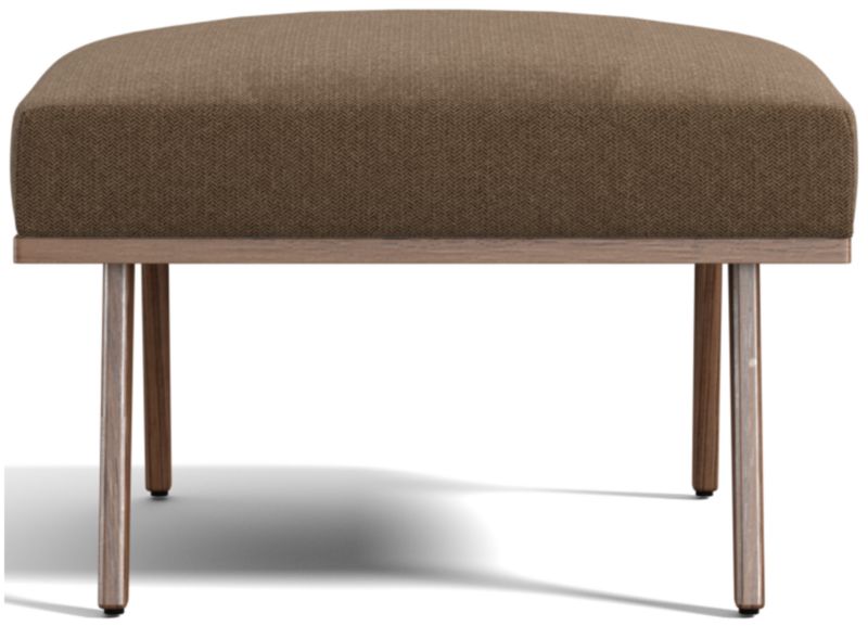 The Cavett ottoman props up feet on a basketweave cushion in varied tones of brown atop sleek, slender legs. The Cavett Ottoman is a Crate and Barrel exclusive.