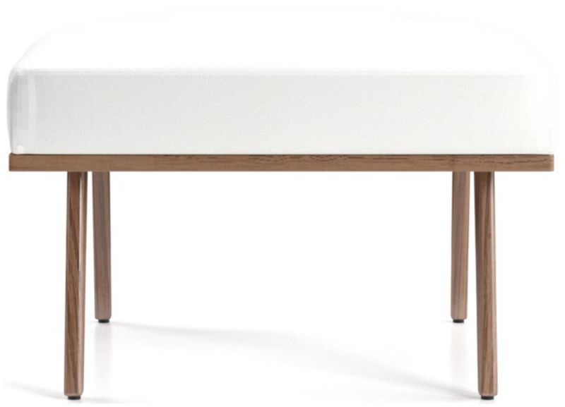 The Cavett ottoman props up feet on a basketweave cushion in varied tones of brown atop sleek, slender legs. The Cavett Ottoman is a Crate and Barrel exclusive.