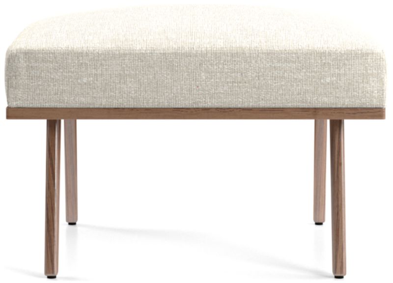 The Cavett ottoman props up feet on a basketweave cushion in varied tones of brown atop sleek, slender legs. The Cavett Ottoman is a Crate and Barrel exclusive.