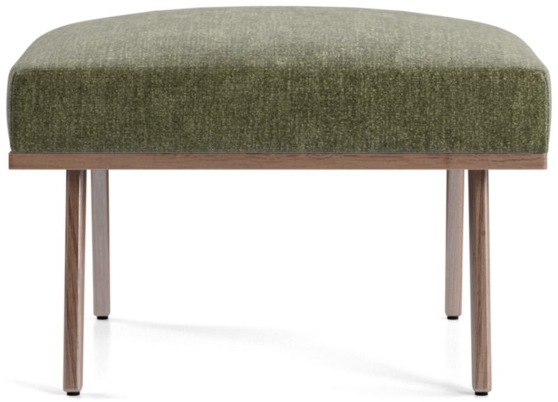 The Cavett ottoman props up feet on a basketweave cushion in varied tones of brown atop sleek, slender legs. The Cavett Ottoman is a Crate and Barrel exclusive.