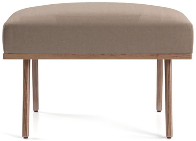 The Cavett ottoman props up feet on a basketweave cushion in varied tones of brown atop sleek, slender legs. The Cavett Ottoman is a Crate and Barrel exclusive.