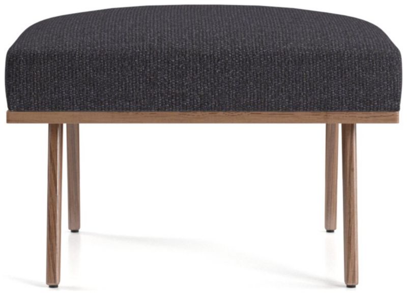 The Cavett ottoman props up feet on a basketweave cushion in varied tones of brown atop sleek, slender legs. The Cavett Ottoman is a Crate and Barrel exclusive.