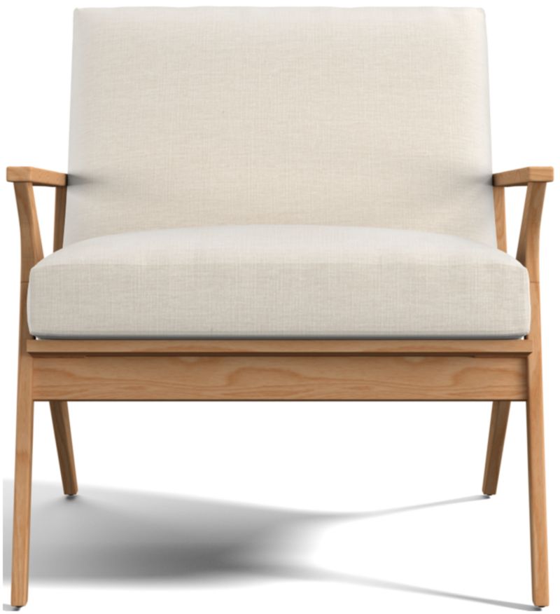 Relax back to another modern time. Our Cavett chair's mid-century lines capture the best of 1950s design in solid ash and cushioned seating upholstered in a warm, textural weave with a hint of retro character. Dramatic streamlined arms, cantilevered seat and vertical slat back attract the eye from every angle. The Cavett chair's slight recline angles you back comfortably with supportive cushions. The Cavett chair is a Crate & Barrel exclusive.