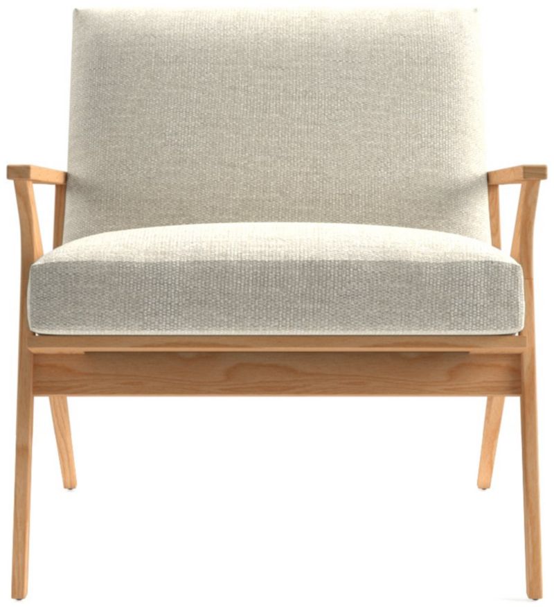 Relax back to another modern time. Our Cavett chair's mid-century lines capture the best of 1950s design in solid ash and cushioned seating upholstered in a warm, textural weave with a hint of retro character. Dramatic streamlined arms, cantilevered seat and vertical slat back attract the eye from every angle. The Cavett chair's slight recline angles you back comfortably with supportive cushions. The Cavett chair is a Crate & Barrel exclusive.