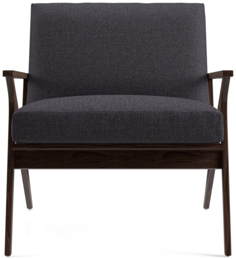 Relax back to another modern time. Our Cavett chair's mid-century lines capture the best of 1950s design in solid ash and cushioned seating upholstered in a warm, textural weave with a hint of retro character. Dramatic streamlined arms, cantilevered seat and vertical slat back attract the eye from every angle. The Cavett chair's slight recline angles you back comfortably with supportive cushions. The Cavett chair is a Crate & Barrel exclusive.
