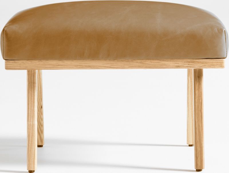 Relax back to another modern time. Cavett's mid-century lines capture the best of 1950s design with this ottoman of solid ash and rich leather. Dramatic design attracts the eye from every angle. A sleek choice for smaller living rooms and family rooms, the leather ottoman upholstered in luxe full-grain, full-aniline leather adds comfort when paired with Cavett Leather Chair. Each leather ottoman is distinguished by the unique characteristics of its beautiful hides, finished with oils and wax for an authentic look that will develop an even richer patina over time. Cavett Leather Ottoman is a Crate & Barrel exclusive.