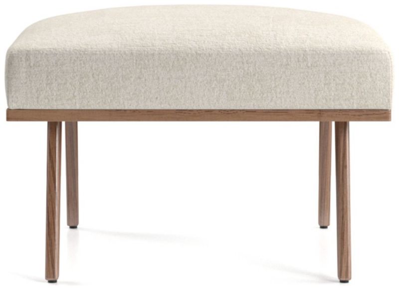 The Cavett ottoman props up feet on a basketweave cushion in varied tones of brown atop sleek, slender legs. The Cavett Ottoman is a Crate and Barrel exclusive.