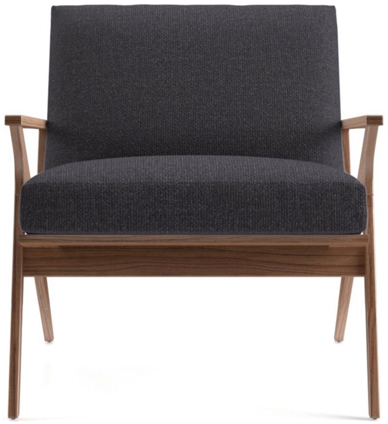 The Cavett chair's slight recline angles you back comfortably with supportive cushions upholstered in a polyester basketweave that layers varied tones of brown. The Cavett Chair is a Crate and Barrel exclusive.