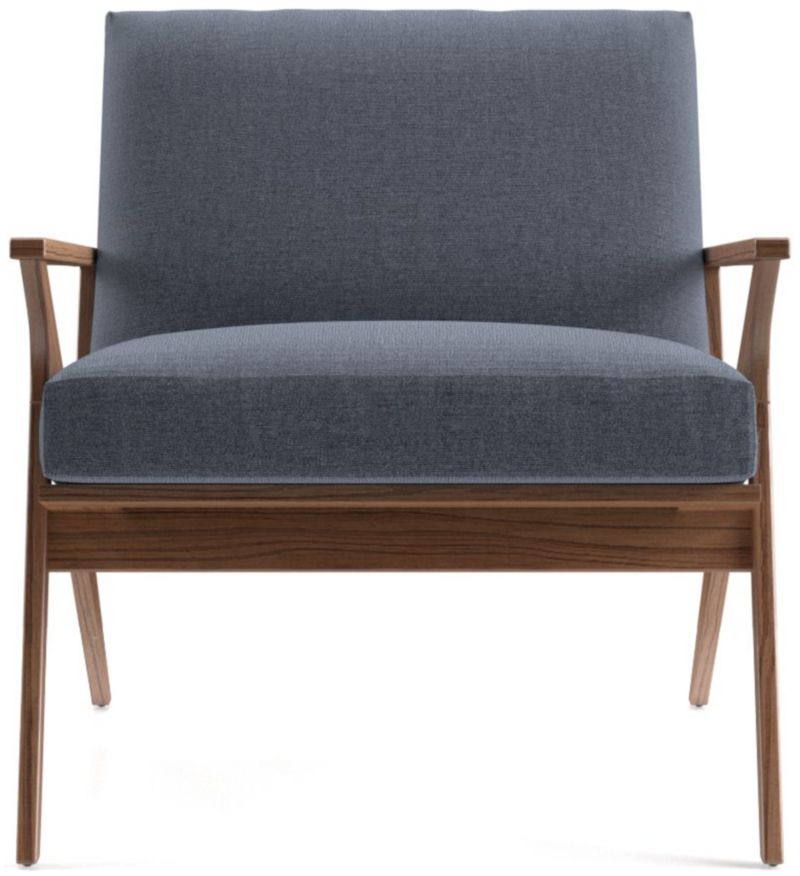 The Cavett chair's slight recline angles you back comfortably with supportive cushions upholstered in a polyester basketweave that layers varied tones of brown. The Cavett Chair is a Crate and Barrel exclusive.