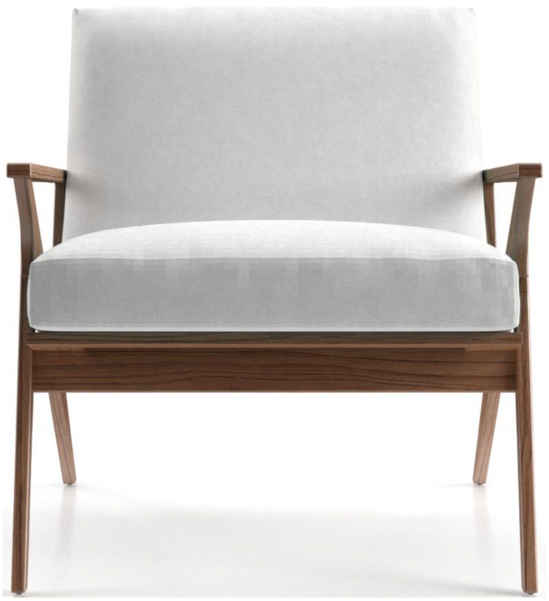 The Cavett chair's slight recline angles you back comfortably with supportive cushions upholstered in a polyester basketweave that layers varied tones of brown. The Cavett Chair is a Crate and Barrel exclusive.