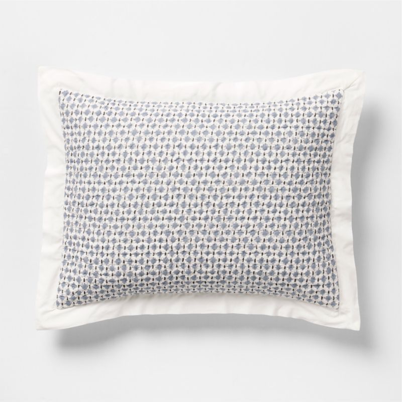 Inspired by vintage wallpaper, our Celeste pillow sham charms with artisanal quality and an heirloom vibe. Skilled craftspeople print the pattern of sky-blue stepped diamonds and black dashes on white organic cotton by hand using traditional blocks. The fabric is then quilted by hand and finished with generous flange borders. Fascinating variations in the printing—one of our favorite aspects of this intensive craft—make each sham beautifully unique. Add the matching quilt to complete the modern-homespun look.