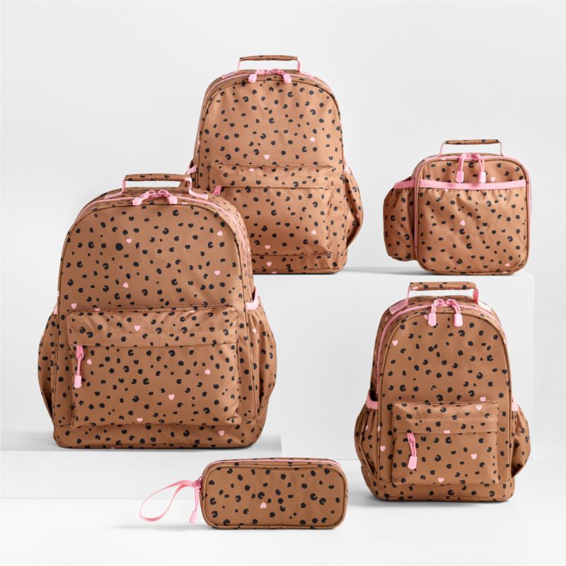 A backpack that's extra comfy and ready to handle a day in the wild. Patterned with cheetah spots and light pink hearts on a tawny brown background, the kids' large knapsack is constructed of supremely durable polyester made from recycled water bottles. A roomy interior holds everything your kid needs—books, school supplies, extra layers—and there's a padded pocket to keep their tablet protected. Outside pockets hold snacks, water bottles and more. For an adventurous combination, pair this book bag with the matching Cheetah Hearts water bottle and lunch box.
