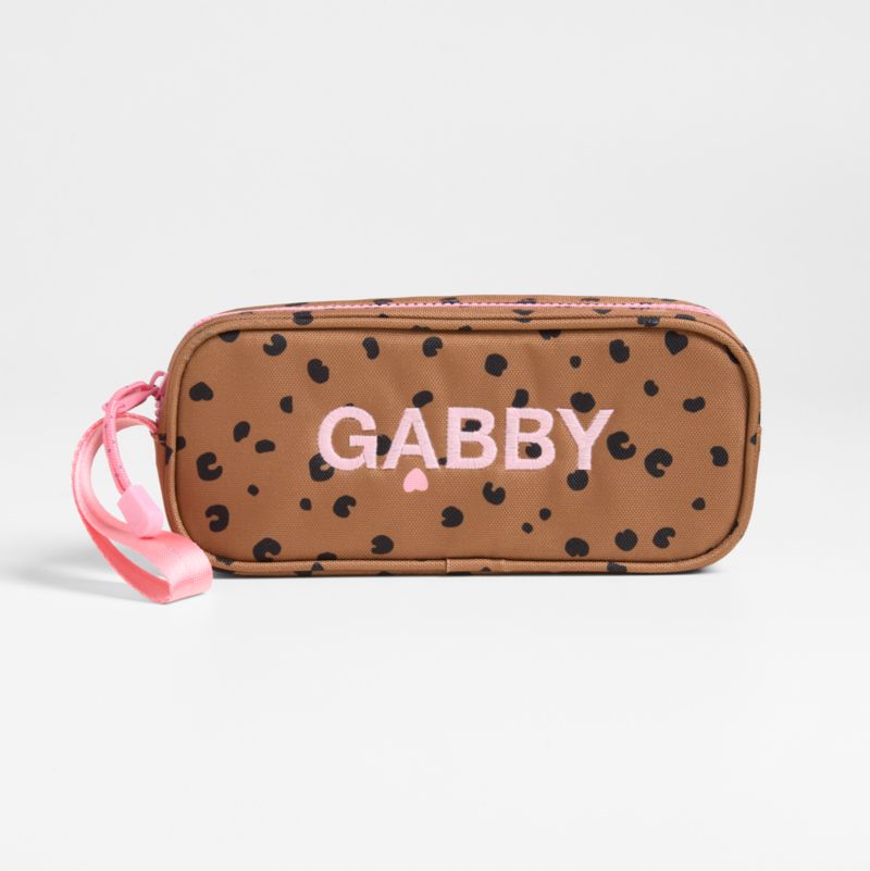 A fun pencil case that's built to handle all the thrills of a day in the wild. Cheetah spots and light pink hearts decorate the bag's tawny brown exterior, and a contrasting pink zipper, zipper pull and loop handle give it the perfect finish. Constructed of supremely durable polyester fabric that includes recycled plastic bottles, our roomy, easy-clean case makes it simple to keep all their pens and pencils organized and accessible. Pair with the Cheetah Hearts lunch box and matching backpack for a totally coordinated look.