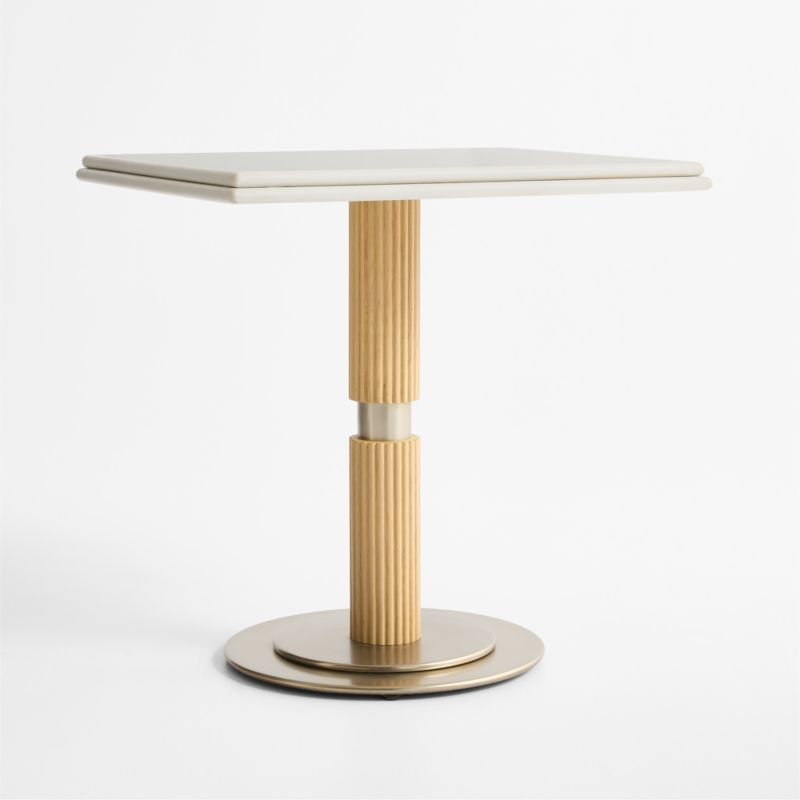 Exquisite materials and dimensional detailing accentuate the modern simplicity of our Chelsea bistro table. A double bullnose edge puts the focus on the gorgeous marble-like veining of the square white quartz top. Set on a circular stepped base, the columnar pedestal is made of light-toned oak with vertical ribbing and an inset metal collar finished in pewter. The perfect bistro table, Chelsea seats two.