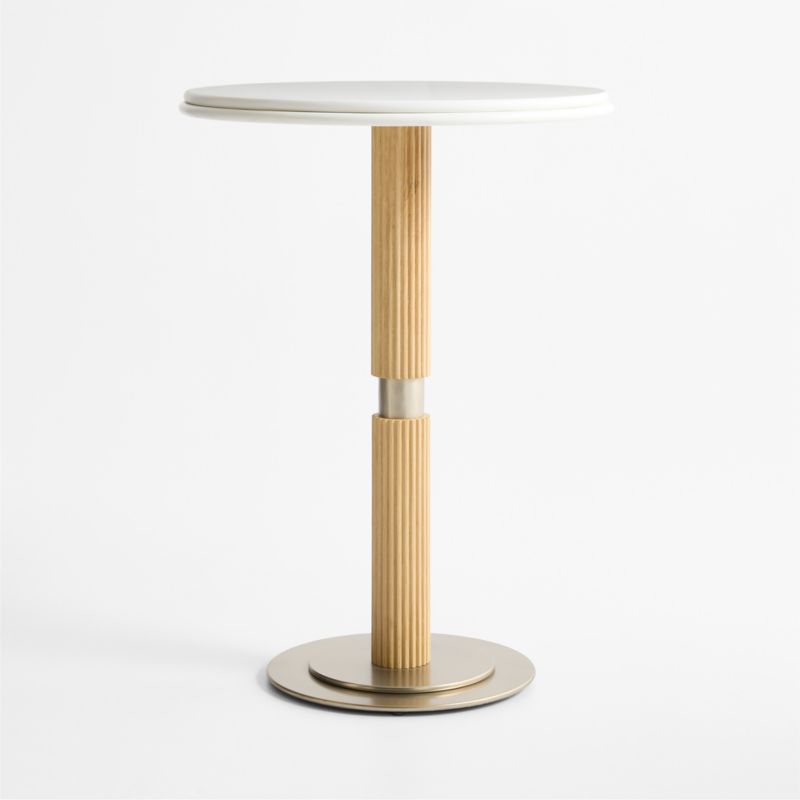 Exquisite materials and dimensional detailing accentuate the modern simplicity of our Chelsea bistro table. A double bullnose edge puts the focus on the gorgeous marble-like veining of the white quartz top. Set on a circular stepped base, the columnar pedestal is made of light-toned oak with vertical ribbing and an inset metal collar finished in pewter. The perfect bistro table, Chelsea seats up to four.