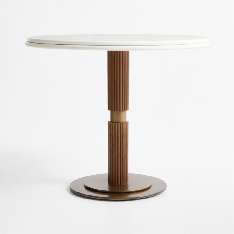 Exquisite materials and dimensional detailing accentuate the modern simplicity of our Chelsea bistro table. A double bullnose edge puts the focus on the gorgeous marble-like veining of the white quartz top. Set on a circular stepped base, the columnar pedestal is made of natural-toned walnut with vertical ribbing and an inset metal collar finished in burnished brass. The perfect bistro table, Chelsea seats up to four.