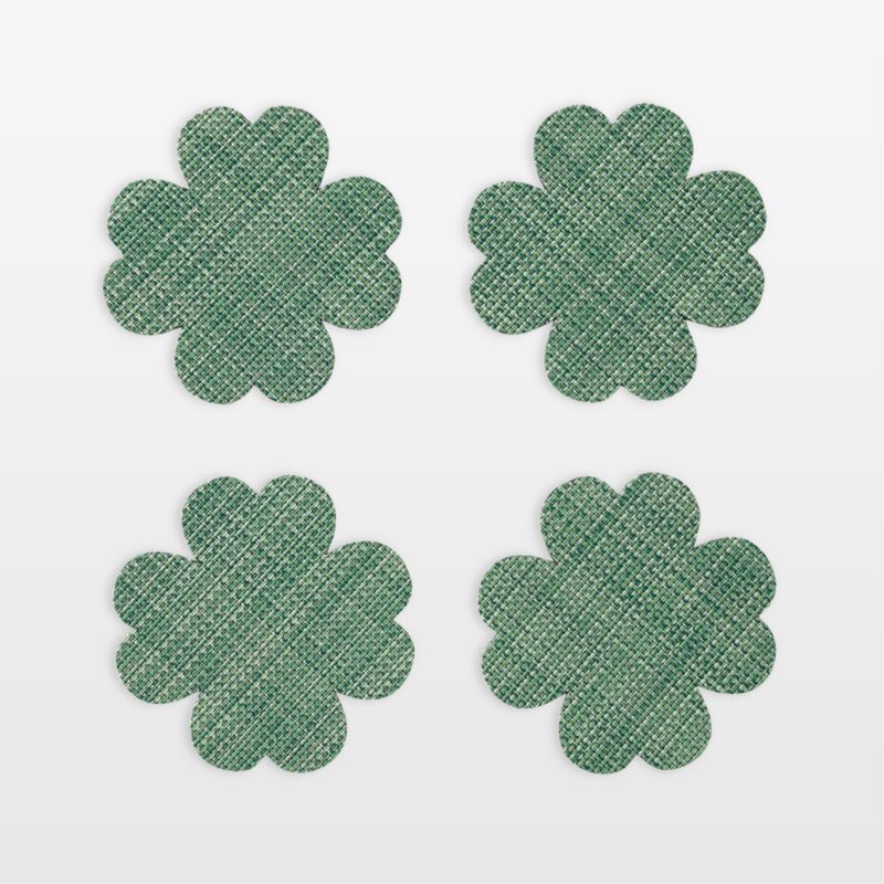 Chilewich's shamrock-shaped coasters add a charming accent to a St. Patrick's Day party or springtime celebration. Showcasing a tweedy, green basketweave, the four-leaf coasters provide a secure foundation for beverages while protecting table surfaces. Each stain-, mold- and mildew-resistant mat is woven of PVC yarns and can be used indoors or out.