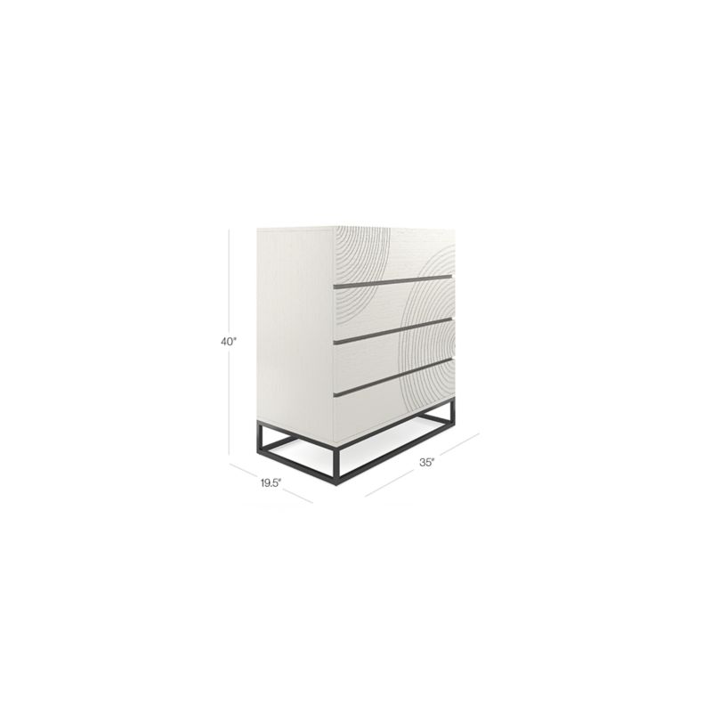 Circulus transforms the bedroom with one-of-a-kind artistry, rhythmic pattern and a light wood finish. Incised lines with a hand-drawn look radiate out in expansive circles across the entire surface of the flat-fronted, four-drawer chest. Floating on an open black iron base, the four-drawer chest is given a white birch finish that makes the most of Circulus's artisanal craftsmanship. Each piece is unique.