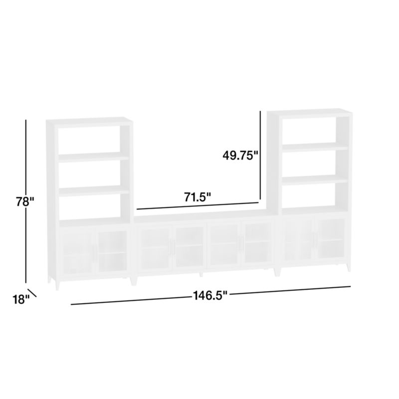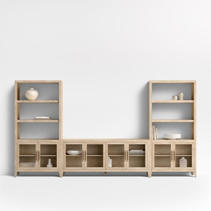 We've translated the refined elegance of our popular Clairemont accent tables into a storage collection made of beautifully grained oak. Standing on tapered legs, the clean-lined media console and bookcase combination features neat mitered corners and recessed panels on the top and sides. Pull handles with distressed leather wrapping provide access to the glass-paned cabinets, each with an adjustable wood shelf. A light driftwood finish with ivory cerusing highlights the wood's beautiful cathedral graining.