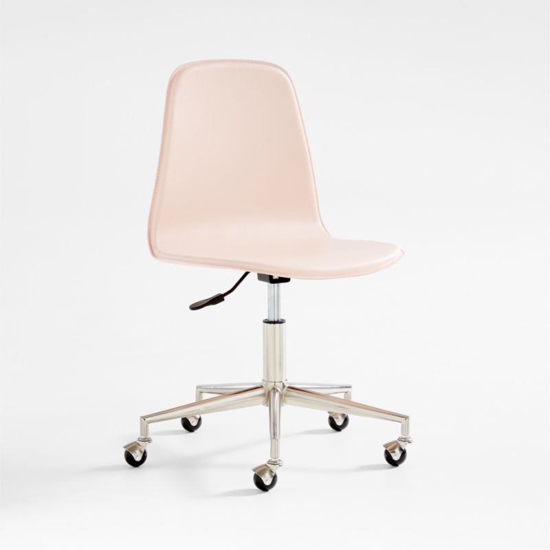 Our seamless, modern take on the classic desk chair, this supportive design lets the good times roll. Beauty meets functionality with a sleek, curved silhouette and 5-leg metal base in a shiny chrome finish. The padded pink seat swivels 360 degrees for easy maneuvering. Designed to grow with kids, this chair also adjusts up and down, and rolling caster wheels travel smoothly over wood, carpet or area rug.
