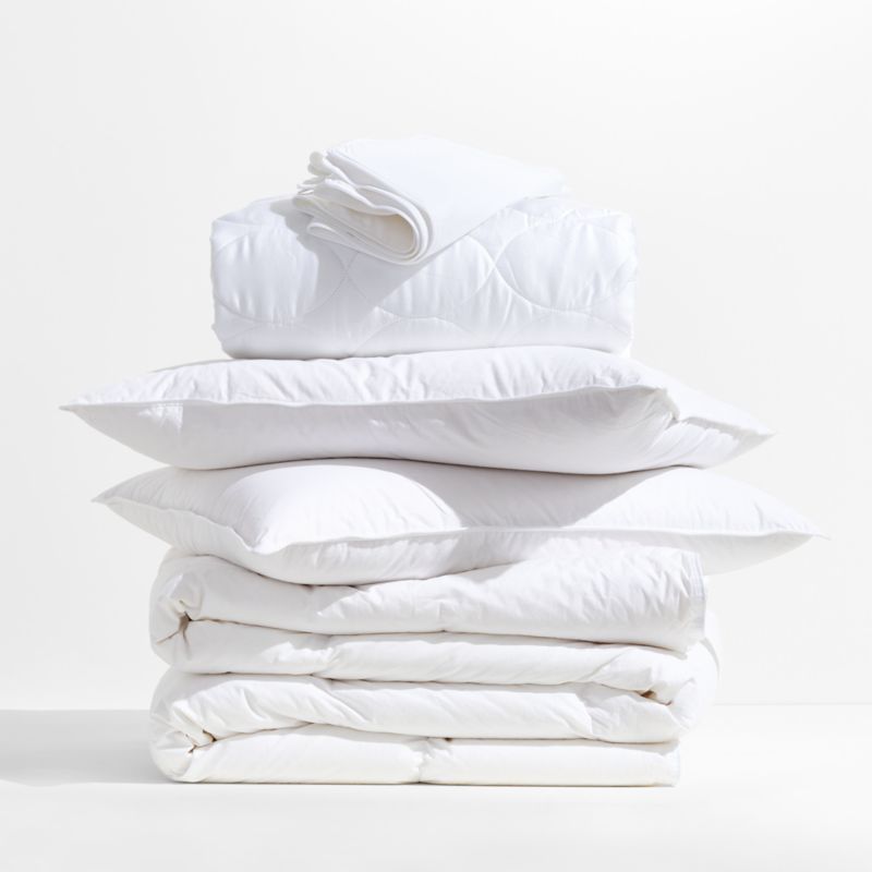 Upgrade your bed or outfit a guest room and save with our exclusive bedding basics set. Constructed with 10-inch baffle-box stitching for maximum loft and minimum shifting of the fill, the medium-weight duvet cover features premium snow-white domestic down and all-season comfort. The pillows offer a core support of feathers wrapped in the fluffy luxury of domestic down for superior quality with a substantial feel, making them ideal for sleepers who prefer a firmer pillow. Down- and feather-proof, pre-shrunk 230-thread-count cambric cotton shells encase the duvet and pillows. Pillow protectors made of 300-thread-count cotton with a beautiful sateen finish keep the bed pillows fresh. A thoughtful housewarming, graduation or wedding gift, our essential set includes a full mattress pad, full/queen duvet insert, two standard pillows and a set of two standard pillow protectors.