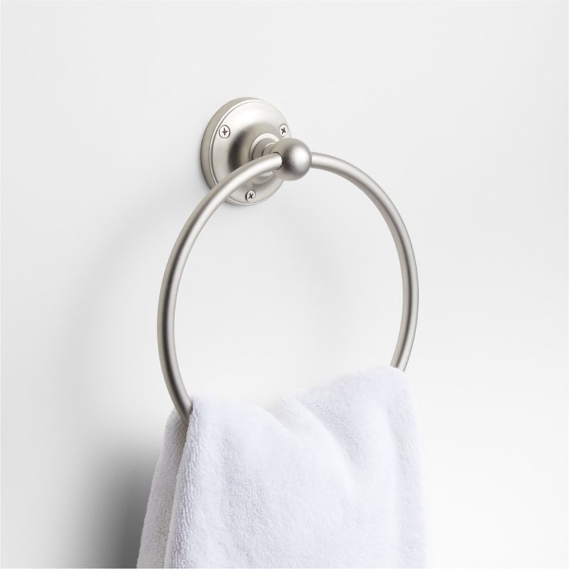 Sometimes it's the small things that pull a room together. That's why we've designed a hardware collection with modern silhouettes, clean lines and a touch of tradition to give your bathroom that perfect finishing touch. We named this hand towel ring Classic for a reason—a slender rod loops through a ball finial on a round, tapered wall plate for a timeless look. Crafted of brass with a brushed nickel finish, the ring has smooth edges and a slim profile. Hardware is included to make it easy to refresh the look of your powder room or bathroom.
