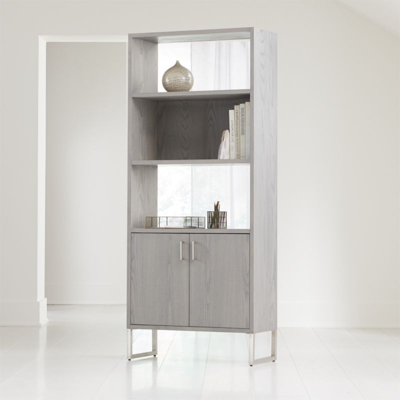 The Clybourn bookcase's ash veneer frame floats on brushed stainless steel sled legs for a striking, architectural look that provides plenty of storage. Our exclusive mid-century modern bookshelf offers space for books, decorative accessories and more on its four fixed shelves—one with a closed back, two with an open back and one behind closed doors. Designed by Blake Tovin of Tovin Design, this sophisticated office essential showcases the natural beauty of ash with a subtly muted, dove-grey finish that emphasizes the wood's dramatic grain. Pair the Clybourn Dove Storage Bookcase with the other dove-finished pieces in our Clybourn furniture collection.
