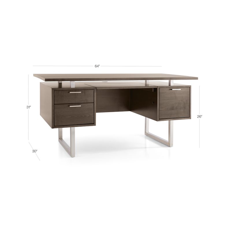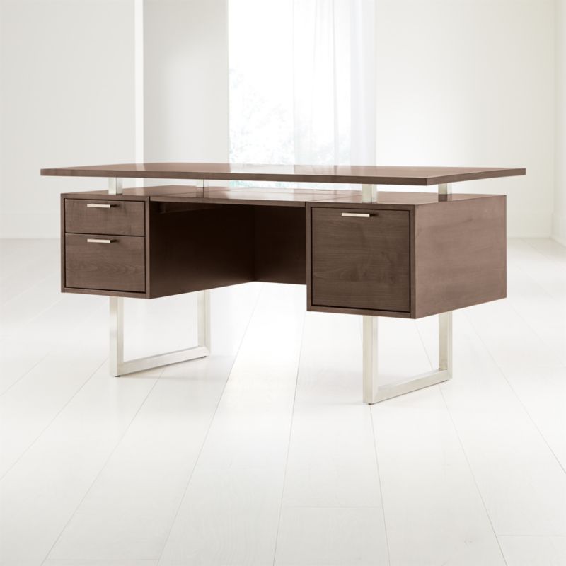 The Clybourn desk's solid maple veneer top floats on brushed stainless steel supports for a striking, architectural look that conceals a functional, integrated slide-out shelf below. Designed exclusively for Crate & Barrel by Blake Tovin of Tovin Design, the mid-century modern desk suspends two storage drawers opposite one legal-letter file with brushed aluminum pulls. Impressive from all angles, the desk's finished back allows it to work mid-room for a flexible office arrangement. Pair the Clybourn Cocoa Executive Desk with the other warm, richly hued furniture in our cocoa-finished Clybourn collection.