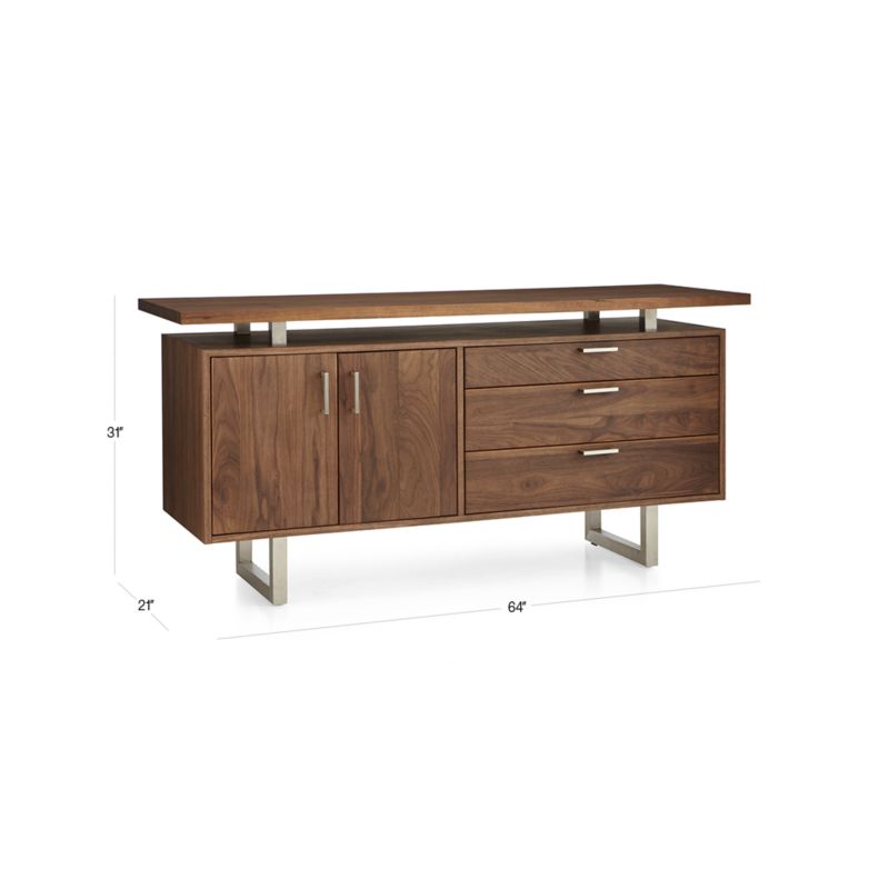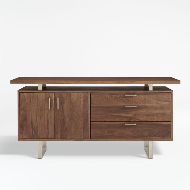 Designer Blake Tovin's distinctive mid-century design suspends a walnut-veneered cabinet and three stacked drawers, outlined with mitered corners and finished with brushed aluminum pulls. Cabinet doors open to one adjustable shelf. The piece performs as an office piece, media stand or dining sideboard. The Clybourn Walnut Credenza is a Crate and Barrel exclusive.