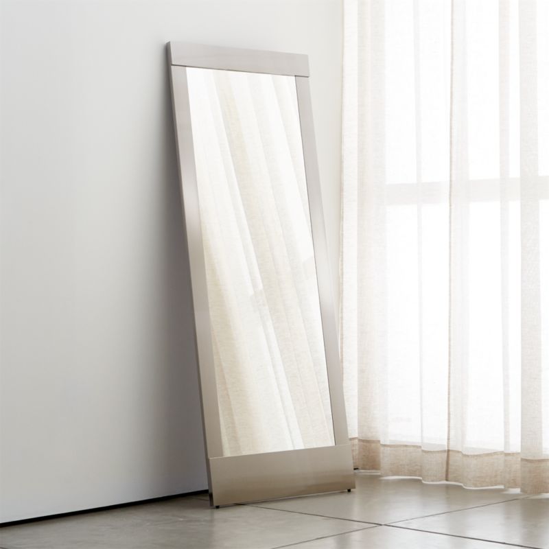 Architectural modern mirror leans against the wall with attitude in a sleek, asymmetrical frame of cool stainless steel with a brushed nickel finish. The silvery frame provides a border of subtle sheen around the reflective glass. This rectangular mirror, a Crate and Barrel exclusive, can be leaned or mounted vertically or horizontally on the wall and is safe for use in the bathroom.