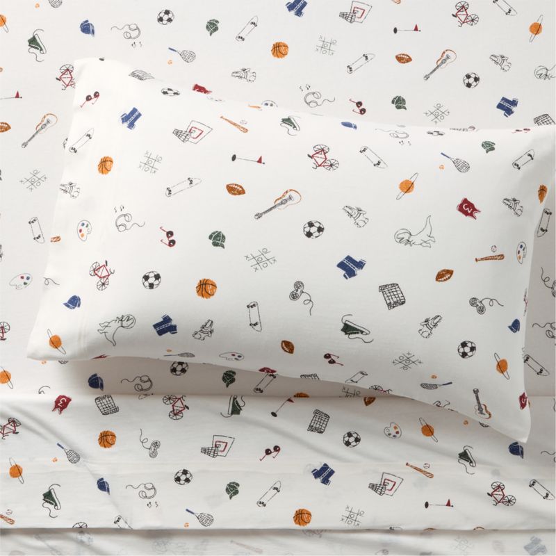Game on for bedtime. Our Victory Vibes sheet set is covered in playful, hand-drawn sports and hobby icons, bringing all kinds of kid passions into one lively, colorful pattern. Made from 100% organic cotton, it's ready for dreamers who love to play hard and snooze well.