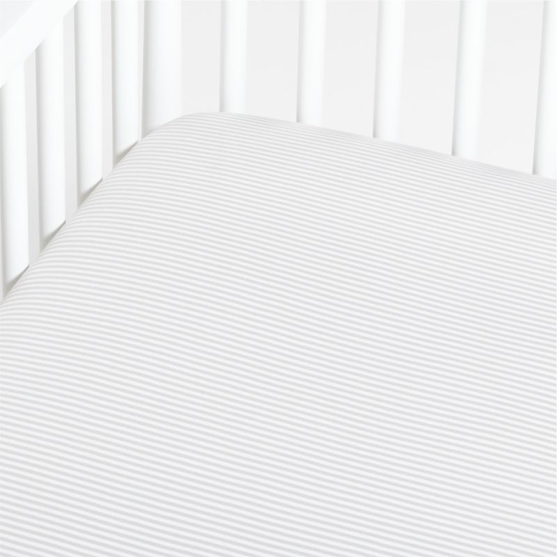 With the same coziness as your most coveted worn-in cotton tee, our supremely soft cotton heathered jersey makes a natural choice for baby bedding that soothes and comforts. In a grey palette that feels fresh and modern, our striped fitted crib sheet is made of organic cotton that's extra-gentle on sensitive skin. An elephant wearing a crown decorates the bottom corner for a playful accent. Pair the crib sheet with any of the colors and patterns in our Organic Heathered Jersey baby bedding collection that's made for mixing and matching to your heart's content.