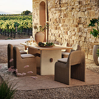 Prefer your patio furniture to have a natural look? Consider a set of unfinished patio furniture made of weather-resistant teak wood. Then, allow it to weather naturally to a mild grey, or add a teak protector to maintain the wood's warm tone. A set featuring a sofa, chairs and a dining table coordinates on the deck or beneath a pergola. Look for Sunbrella cushions in the same bright hue or pattern for a uniform feel. Or, shop individual pieces for your balcony, front steps or lanai. If you're a frequent warm-weather host, consider outdoor kitchen furniture like a combination bar and workstation or a table drop leaf table for extra surface area. Ottomans also provide for versatile use—acting alternatively as foot rests or additional seating. Complete your outdoor entertaining space with melamine dinnerware, outdoor lighting and planters to showcase fresh blooms.