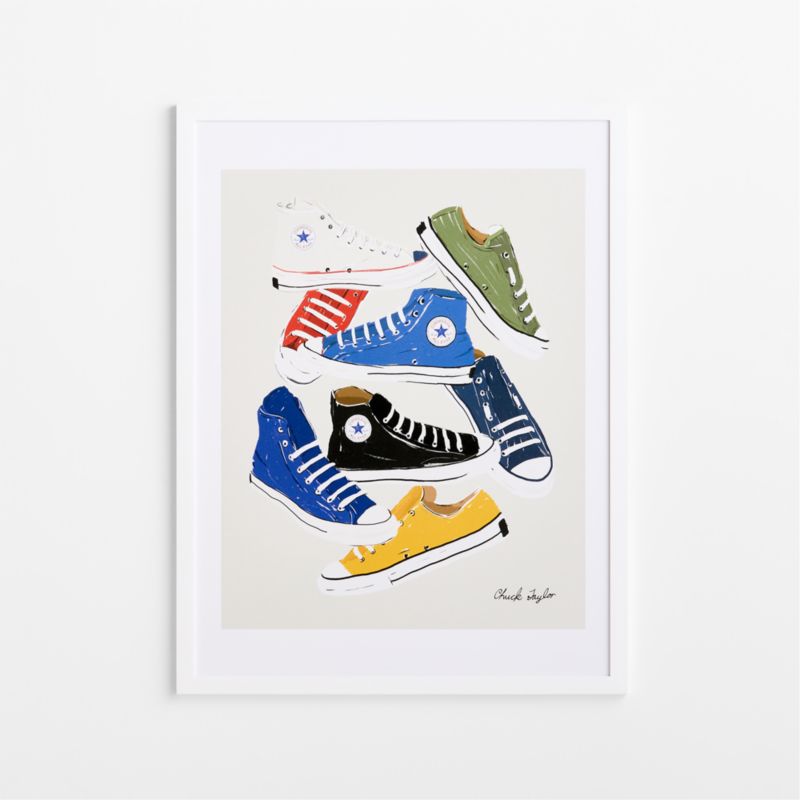 From the streets to the walls—introducing our art collection created in collaboration with iconic sneaker brand Converse. Featuring a jumble of legendary Chuck Taylors, the art is printed on giclee paper to bring out every vibrant detail. In a modern white frame protected by shatter-proof acrylic, the art brings a bright kick to kids' spaces, and will delight sneakerheads of all ages.