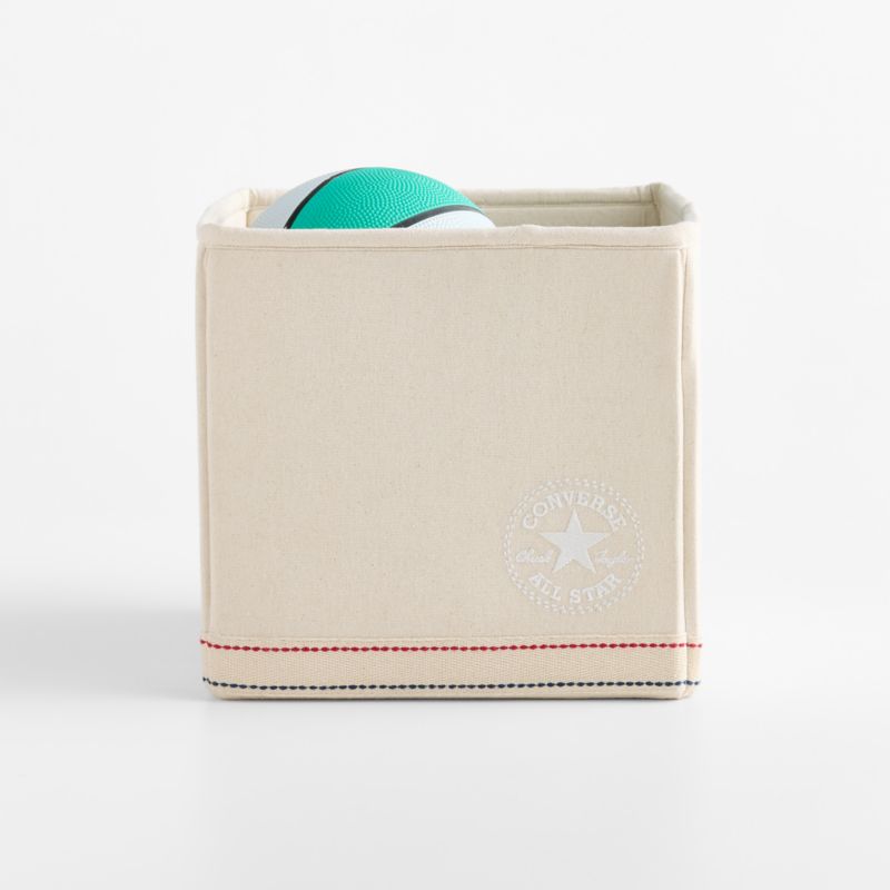 Our Converse shelf bin combines practicality with the cool factor of the beloved brand. Crafted of undyed organic cotton canvas, the bin features a twill tape border with red and navy embroidery as a nod to the brand's iconic sneaker sole, along with a tonal embroidered Chuck Taylor patch. Designed to hold toys, balls and all the odds and ends that kids amass, the bin is sized just right for our Converse Vent Bookcase (sold separately).