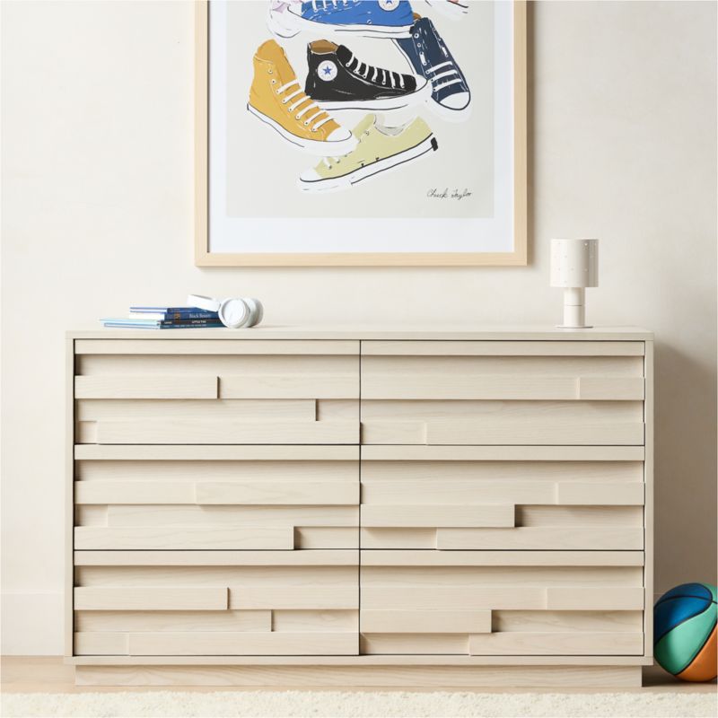 Teaming up with Converse, we went into overtime to create a kids' room collection that's built to last and forever cool. Inspired by the floor of a basketball court, this modern dresser features a series of ash wood planks in an offset, geometric pattern. In a light, versatile whitewashed finish, the piece is a stylistic slam dunk—whether you're outfitting a nursery or a teenager's room. Six drawers provide ample storage space.