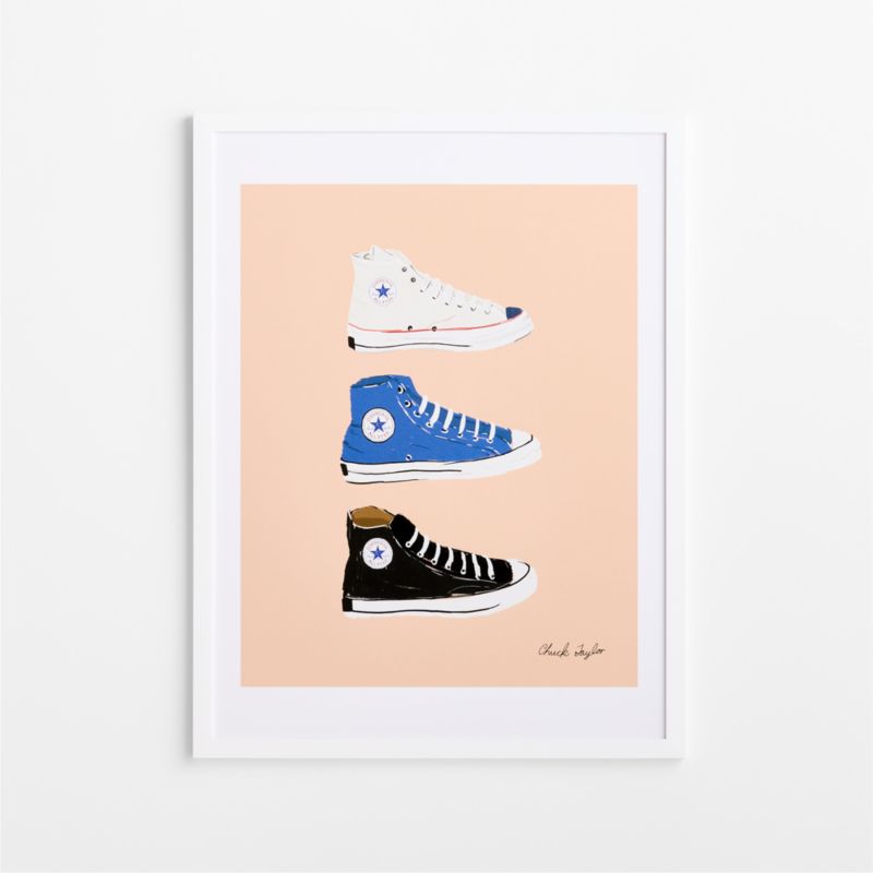 From the streets to the walls—introducing our art collection created in collaboration with iconic sneaker brand Converse. Featuring a trio of legendary Chuck Taylors, the art is printed on giclee paper to bring out every vibrant detail. In a modern white frame protected by shatter-proof acrylic, the art brings a bright kick to kids' spaces, and will delight sneakerheads of all ages.