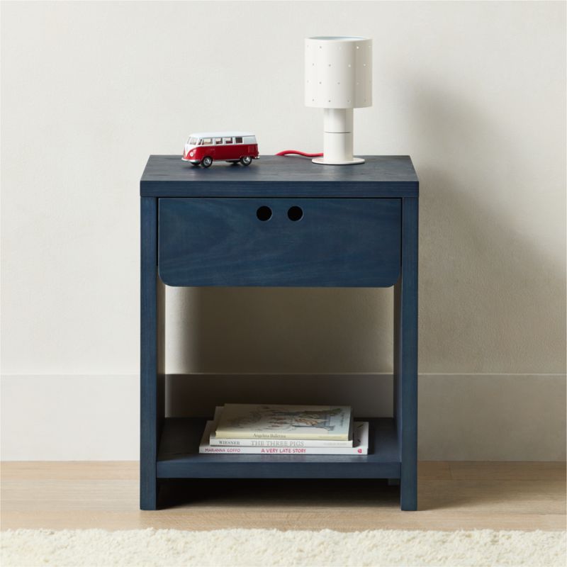 Designed in collaboration with Converse, this nightstand serves up practical storage with a side of street style. A drawer provides handy stash-away space, while a lower shelf stands ready for favorite bedtime reads. In a wink to the brand's iconic Chuck Taylor sneaker, we designed grommet-inspired round finger pulls, and a curved drawer bottom reminiscent of the tongue of a sneaker. A deep navy blue finish brings rich color to a room while allowing the wood's natural grain to show through.