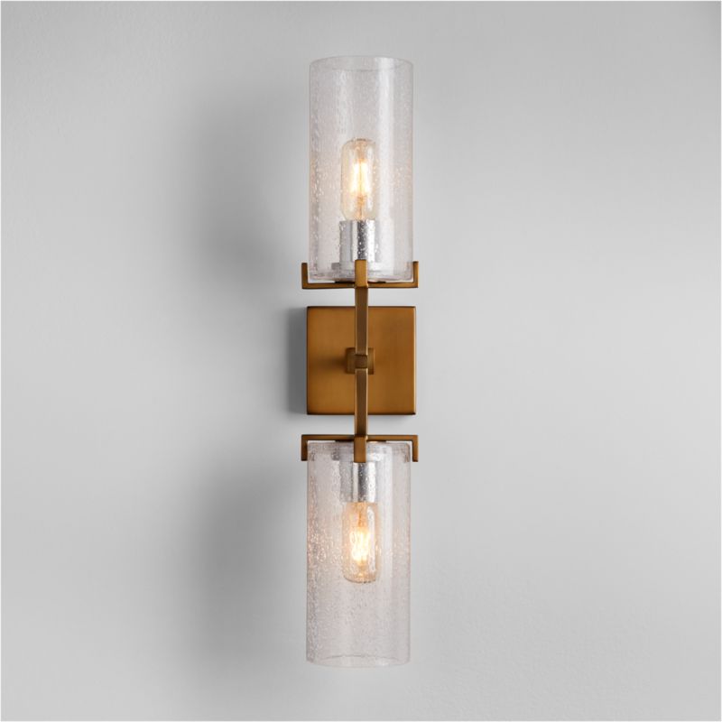 Our Coquina two-light sconce makes it easy to wash your walls in ambient light. The sconce showcases a single bulb within a subtly bubbled clear glass cylinder shade at both ends to cast light up and down. The steel base adds linear contrast in burnished brass. We love our exclusive Coquina double sconce in multiples, lining a hallway or flanking a bookcase or mantel.