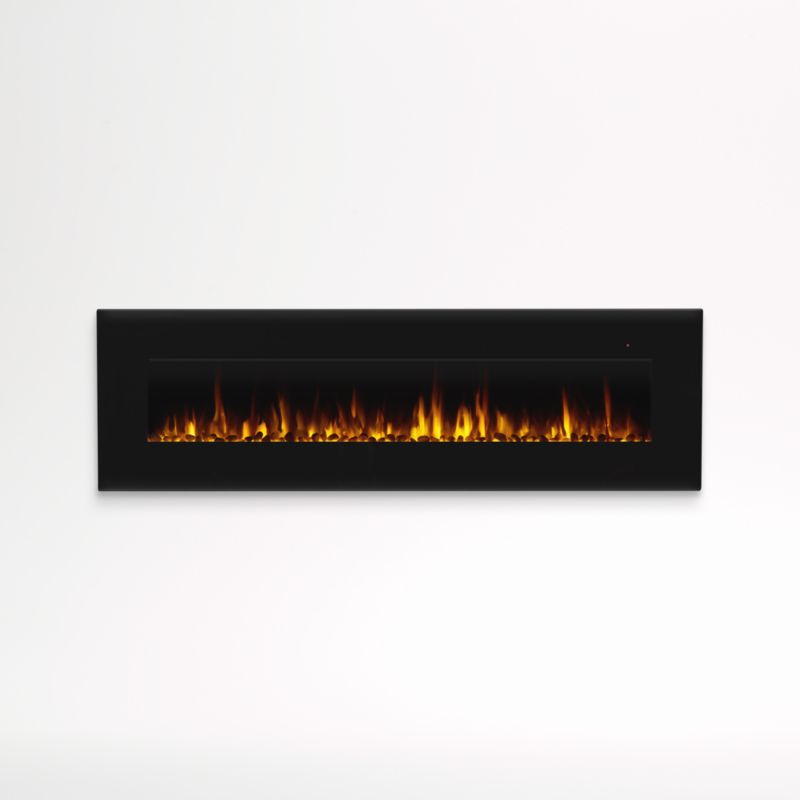 A modern fireplace for modern living. Create a covetable feature in your home with this sleek and stunning wall-hung hearth. The low-profile electric fireplace stuns with clean lines and black-finished steel, the black-bordered glass highlighting the drama of the dancing flames. Customize the look of your fire with two included fill options—white rock and clear glass—and six flame color choices. Providing supplemental heat for up to 1,000 square feet, the fireplace offers settings from 62°F to 82°F as well as a heatless flame option for those times when you want the look but not the feel of fire. The remote control allows you to adjust all of these variables and more from your sofa or bed.