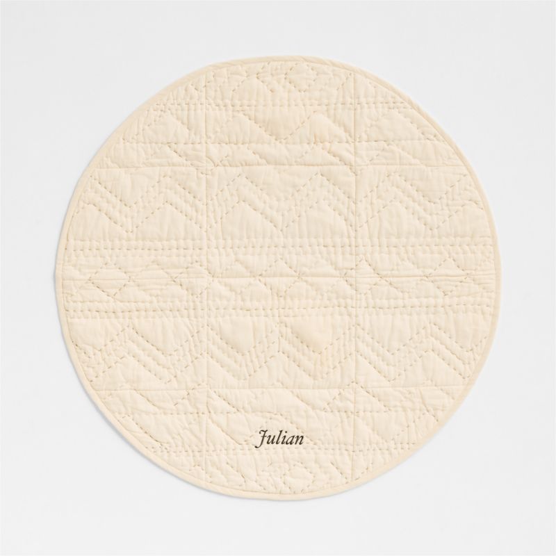 Our Cozy Cloud natural undyed cotton baby activity mat provides an exceptionally soft surface for tummy time, playtime and impromptu diaper changes. The organic undyed cotton is gentle on babies' delicate skin, while the quilted pattern gives it a tactile quality they'll love. For taking the fun on the road, it folds up neatly and has built-in handles for carrying. With the option to monogram, the mat makes a special—and especially useful—gift for new parents.