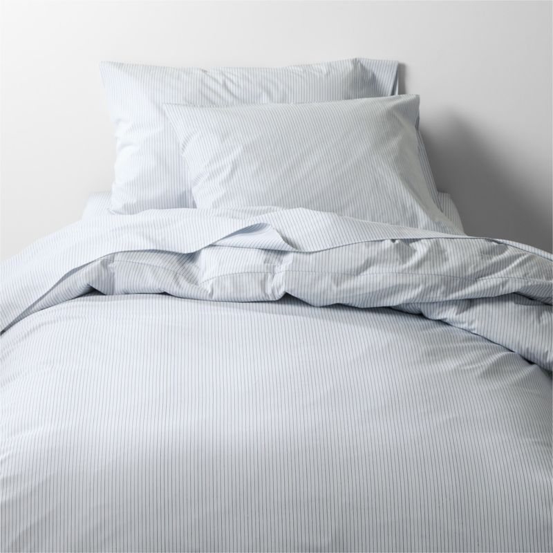 Our CozyCloud bedding collection makes a dreamy dorm room bed. This organic cotton extra-long twin duvet cover in a breathable percale weave sleeps cool, while the supersoft washed finish keeps things cozy. The look is a fresh and casual take on a classic, with sky blue and midnight navy pinstripes on crisp white. We love this duvet mixed and matched with our other solid and patterned bedding in the same tonal palette.
